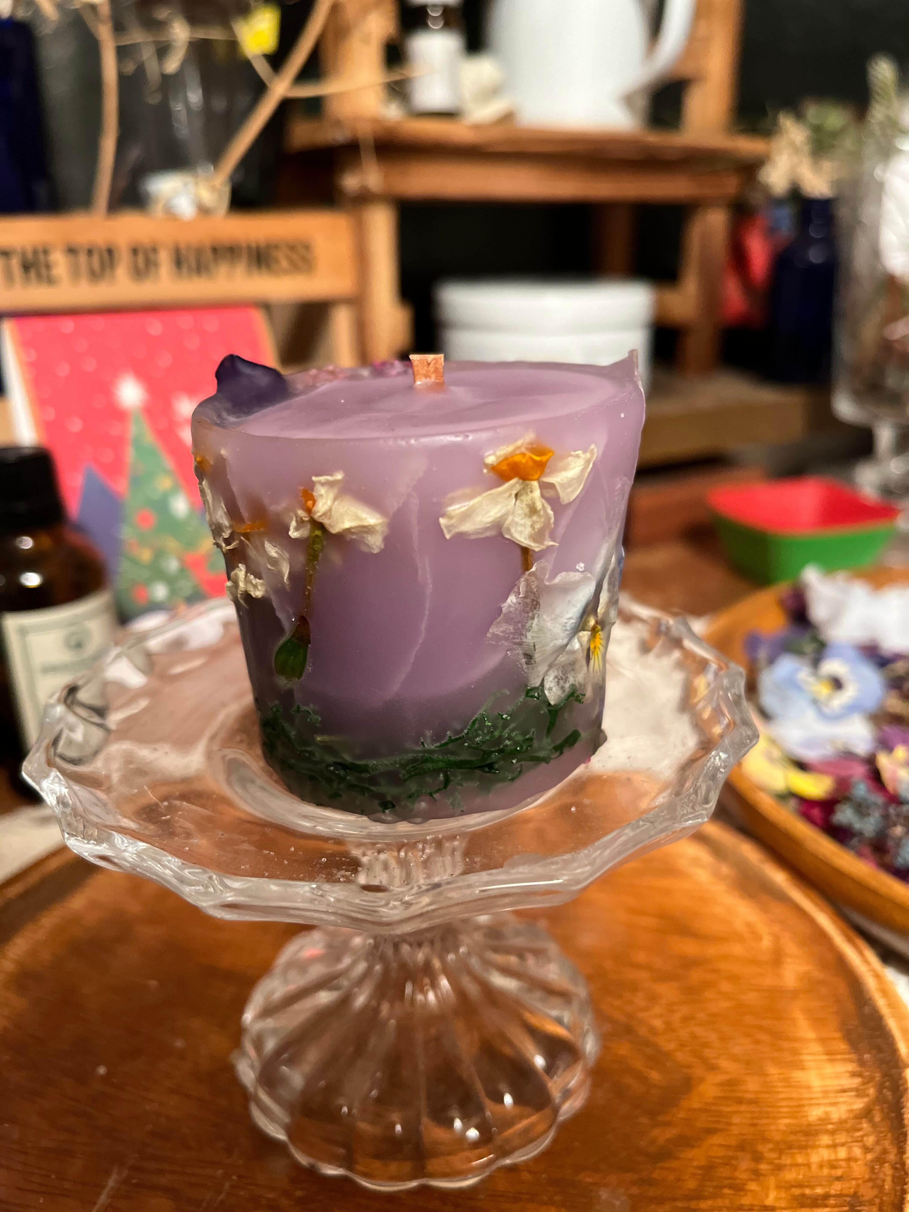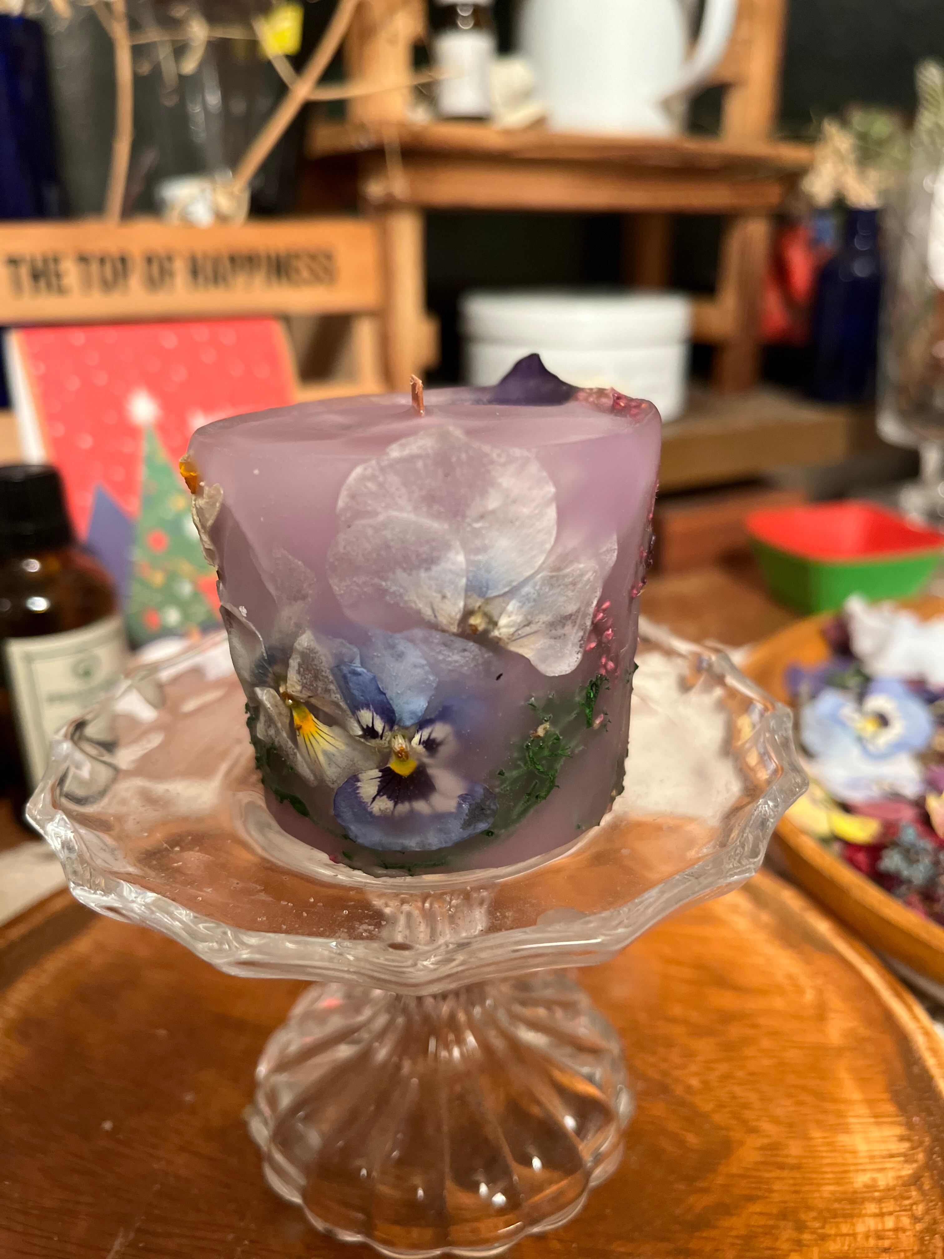 水仙とビオラをドライにしてキャンドルにしました。他のドライも天然素材です!
